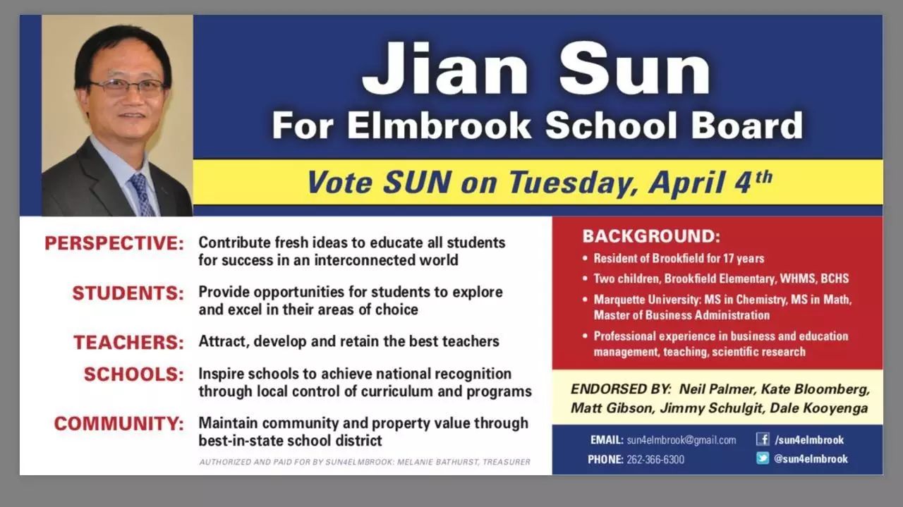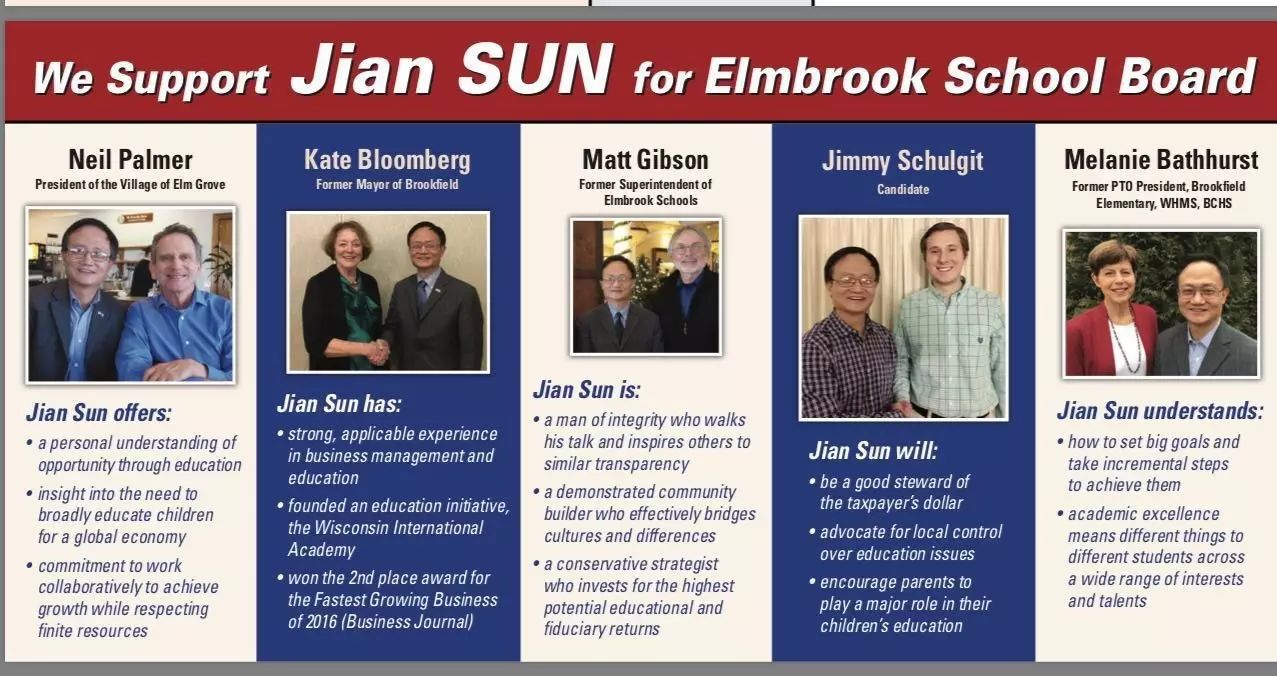 孙建国此次参选Elmbrook学校教育董事会成员是该市第一次华人竞选参政。为了让人们了解他的教育理念,他更是不惧风雪挨家换户敲门与居民们交谈。他的助选团队 (由密城华人社区组织) 也是在寒风中走街串巷,发送传单。他们精心制定竞选措施计划,并号召华人们团结一心鼎力相助。虽然竞选的是一个市区的校董职位,但作为华人参政,其意义远大于职位本身。