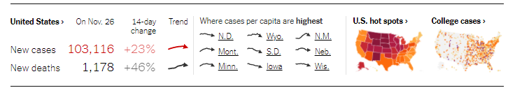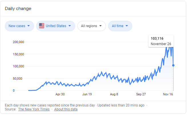 相比之下,美国累计新冠病例接近1300万,死亡超过26万,在11月26日感恩节这天新增病例超过10万,新增死亡1178人。令我感慨不已。今年的感恩节,可以说是美国历史上和平时期最悲情的一个,无数家庭无法团圆欢聚,绝大部分的医护人员夜以继日地战斗在第一线,数以百万计的人不得不自我隔离,甚至在和病毒进行生死较量。