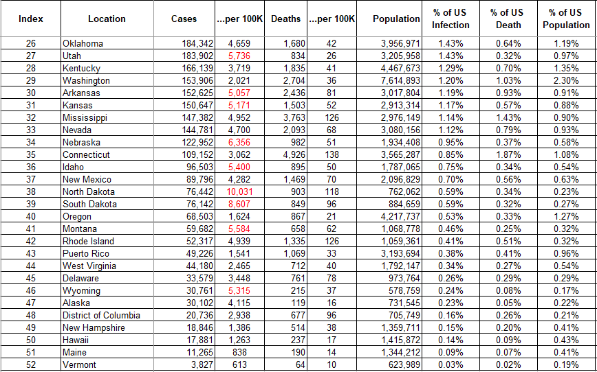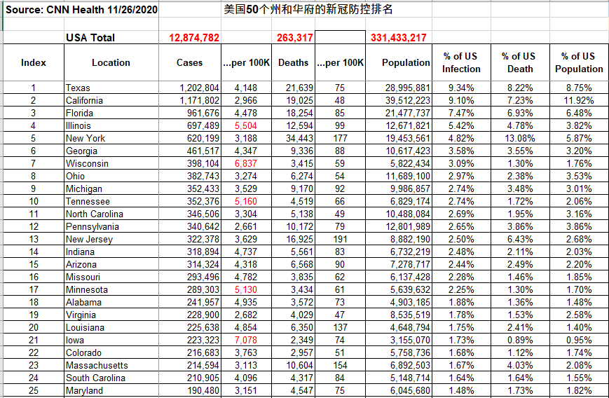 为什么澳大利亚和新西兰能够有效地控制新冠,而美国就如此惨不忍睹呢?而且东亚国家和地区的新冠防控成绩比澳大利亚和新西兰还要好(见前文全球排名比较)。是什么原因造成如此天渊之别呢?暂且按下不表,让我们先来看看美国50个州和华府的新冠防控表现如何。原始数据来源于约翰霍普金斯大学,截止日期为11月26日。