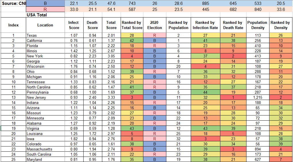 - 虽然目前德州的累计病例数字(1,202,804)是全美国最高的,但是根据以上的百分比计算,其累计感染分数是9.3%/8.7%=1.07,累计死亡分数是8.2%/8.7%=0.94,总分=1.07+0.94=2.01,这恰好是非常接近及格(2.0)的分数,迄今为止排名28。