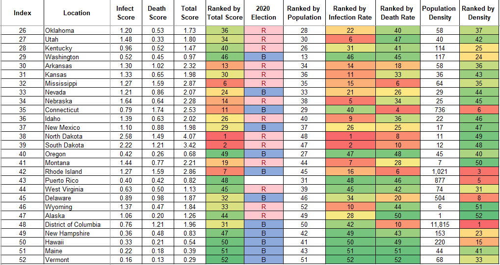 - 第一名(总分最高,即防控最差)是北达科他州,感染百分比0.59%和死亡百分比0.34%,高于其人口百分比0.23%,因此感染分数2.58,死亡分数1.49,总分4.07。其感染概率是每10万人10,031,全美国最高,死亡概率是每10万人118,全美排第8。