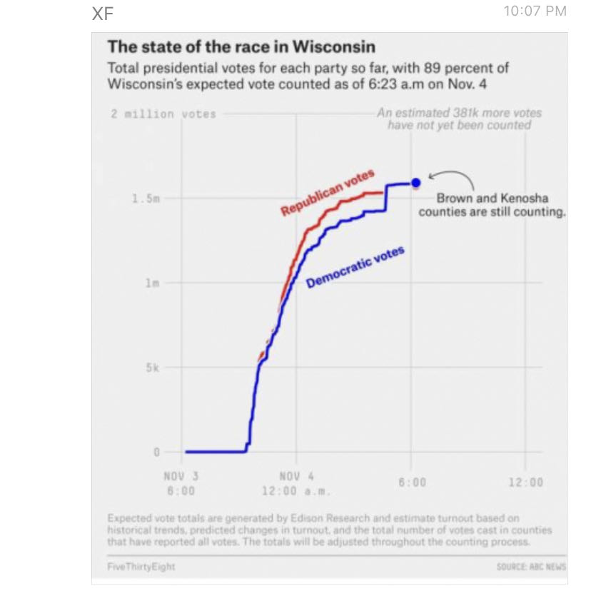 2/23/2021杨子竹:我现在回复关于你(倾听者)的第一点质疑,川普的得票数增加了的曲线轨迹,以下这段文字与图像已经表达得非常完整,如果你还不能理解,那我真的怀疑你的理解能力,请你再次仔细阅读一下文字:“FiveThirtyEight”的美国大选即时更新网页上亦可找到同一图表(而且较高像素),该网高级科学编辑Maggie Koerth指威斯康星州最大城市密尔沃基(Milwaukee)的提前投票结果令原本落后的拜登反超前,但两人得票仍非常接近。