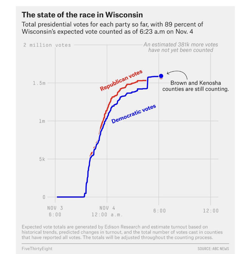 在约半小时后,Maggie Koerth回应对图1的质疑,解释密尔沃基市公布提早投票结果,把17万张选票的数字加上图表,引致看似奇怪的直线上升,并提供当地媒体报导作证据。翻查当局数据,密尔沃基市收回的缺席选票(absentee vote)有169,519张,而当地电视台《WTMJ-TV》的报导则指特朗普取得当中23,642票(占14%),拜登取得143,124票(占84%),拜登得票为特朗普的6倍左右。