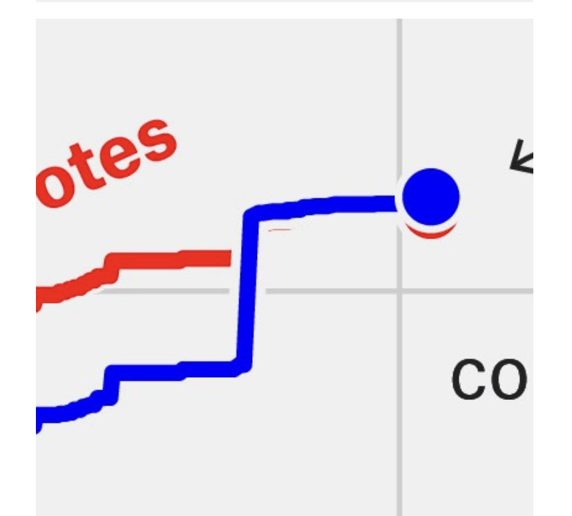 若放大“FiveThirtyEight”的较高解像版本图表(见下图),可发现蓝线画在前面,而且有灰色边框,以致在“直线上升”一段蓝线遮盖了大部分红线,然而仍能看到红线边缘,可见在此处特朗普得票仍有增长。由于不少网民分享解像度较低的版本,或会造成“拜登得票直线上升,特朗普得票没有/轻微增加”的错觉