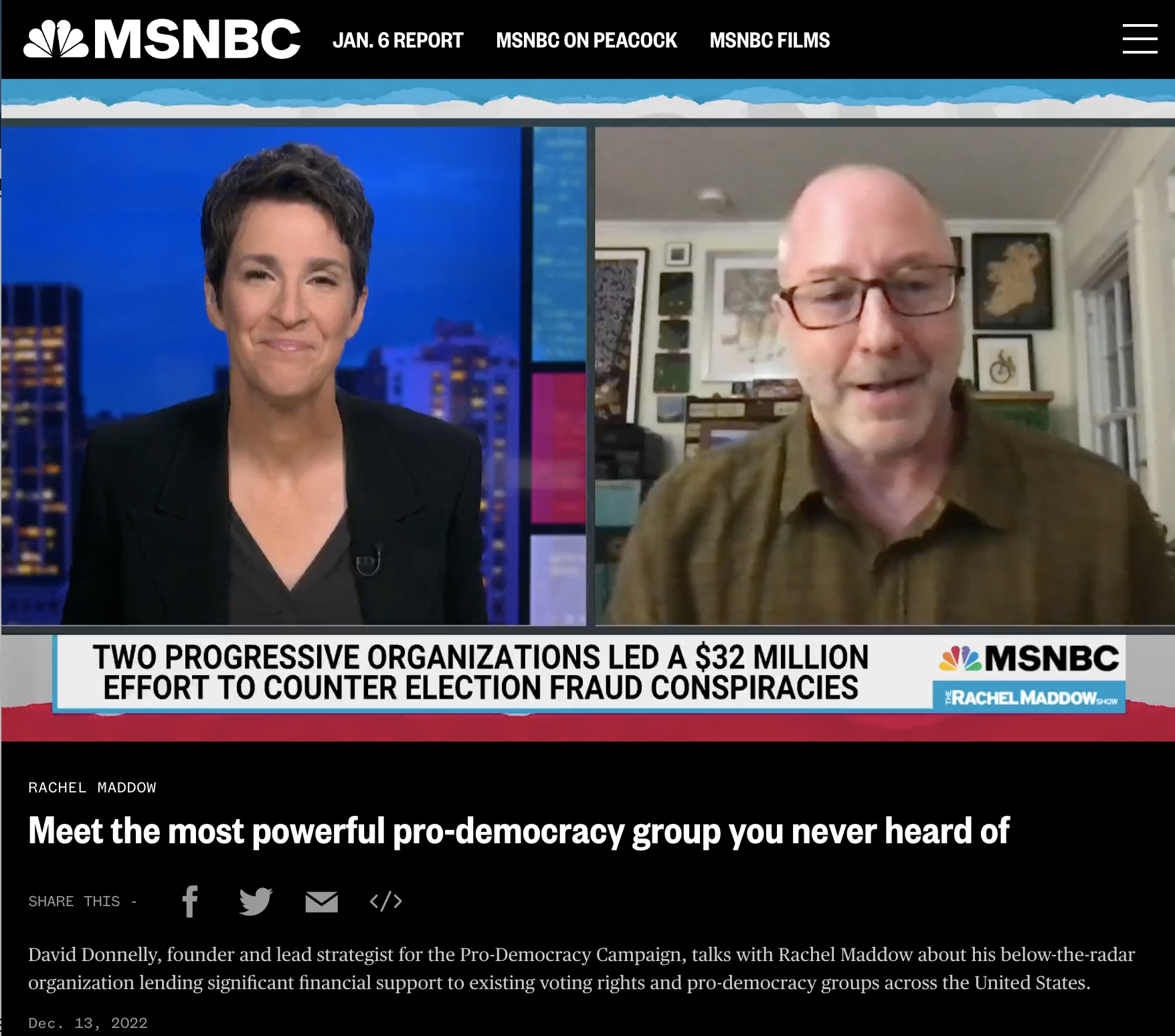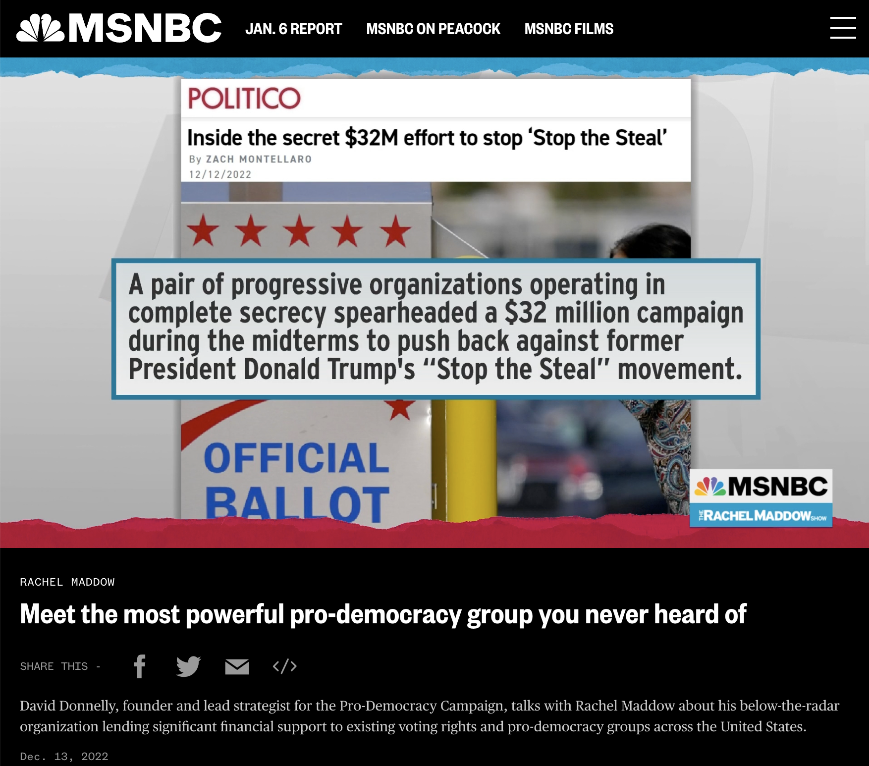 2020年一场公正的选举,川普拒绝承认选举结果,并亲自指挥导致1月6日拒绝认证选举结果的冲击国会的暴乱,这种否认公正选举的结果和破坏权力移交都是对美国宪法与司法独立的挑战。中期选举之前,川普与其追随者继续散步选举舞弊的虚假言论。在州和地方一级出现了无数的团体,宣传选举阴谋论,扩大关于选举合法性的虚假说法。这些团体被组织成几个重叠的联盟,有些情况下有川普的盟友参与。面对这种破坏民主的所谓的“Stop the Steal”的行为与组织,有人坚定地站出来,默默无闻地与这种破坏民主的势力作斗争,充分显示了美国人民的民主智慧。这个由David Donnelly组织的捍卫公民投票的信息,由POLITICO率先于12月12日报导披露,David组织了两个新成立的团体:Pro-Democracy Center 和 Pro-Democracy Campaign。这些团体在全国各州开展活动,因为选举制度面临着来自川普及其盟友的前所未有的压力,他们谎称 2020 年的选举被窃取。有无名的捍卫民主的16位好心人秘密捐助3200 万美元,由总策划师David Donnelly发起了努力阻止 川普的“Stop the Steal”谎言护宪行动,支援了16个州的126个组织,确保公民的投票权力与安全。
